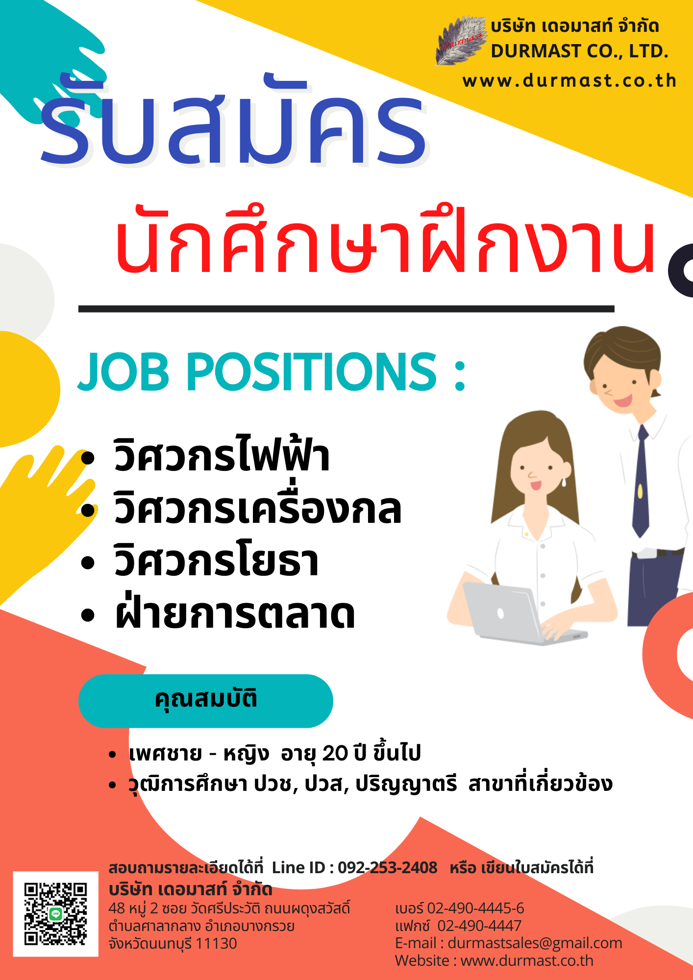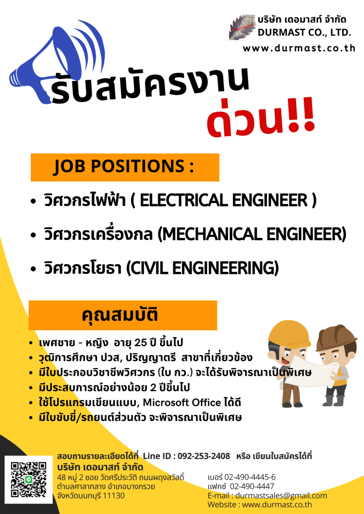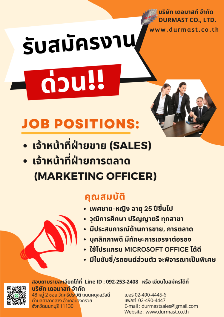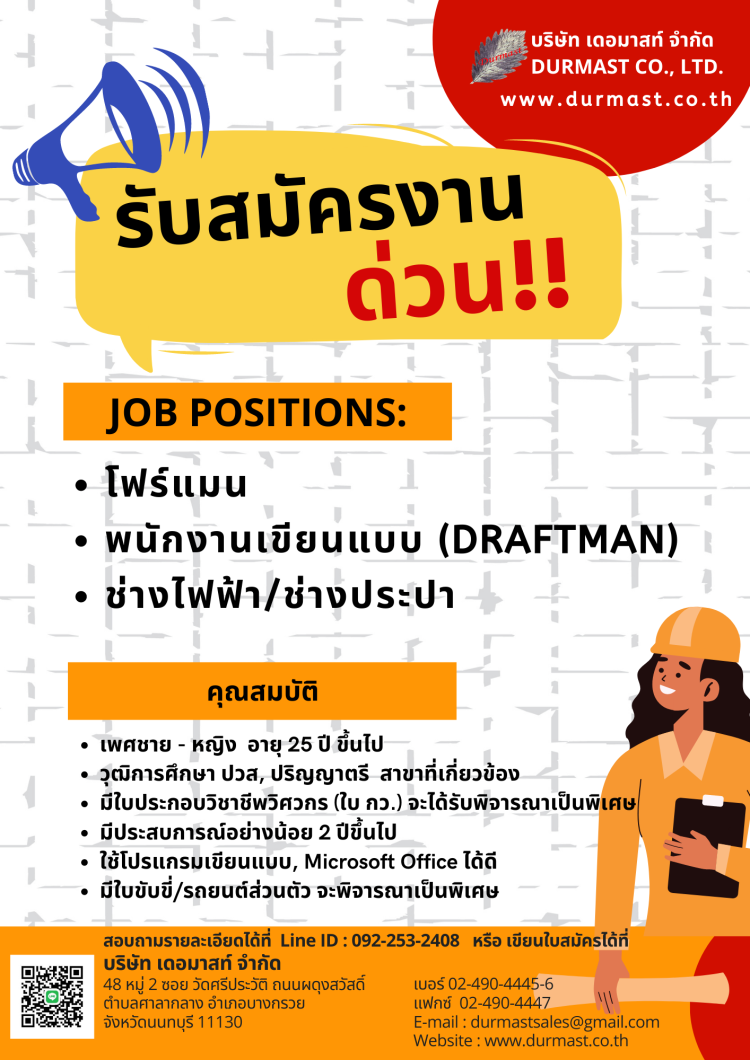 ร่วมงานกับเรา บริษัท เดอมาสท์ จำกัด เป็นบริษัทประกอบธุรกิจนำเข้าผลิตภัณฑ์วัสดุป้องกันไฟและควันลาม (Fire Barrier System) และ รับเหมางานติดตั้งงาน ระบบวิศวกรรมต่างๆ (งานระบบไฟฟ้าและสื่อสาร, ระบบสุขาภิบาลและป้องกันอัคคีภัย, ระบบปรับอากาศและระบายอากาศ) ครอบคลุมถึงงานวิศวกรรมโยธา ระยะเวลามากกว่า 27 ปี ทางบริษัทฯ มีผลงานให้กับโครงการต่างๆ เช่น สนามบิน, รถไฟฟ้า, ศูนย์ราชการ, ศูนย์ข้อมูล Data Center, โรงพยาบาล, โรงแรม, สถาบันการศึกษา, อาคารสำนักงาน, คอนโดมิเนียม เป็นต้น เรากำลังมองหาบุคลากรผู้ที่มีความรู้ความสามารถเข้าร่วมงาน โดยส่งข้อมูลมาเพื่อพิจารณาทาง E-mail : durmastsales@gmail.com | ![]() |